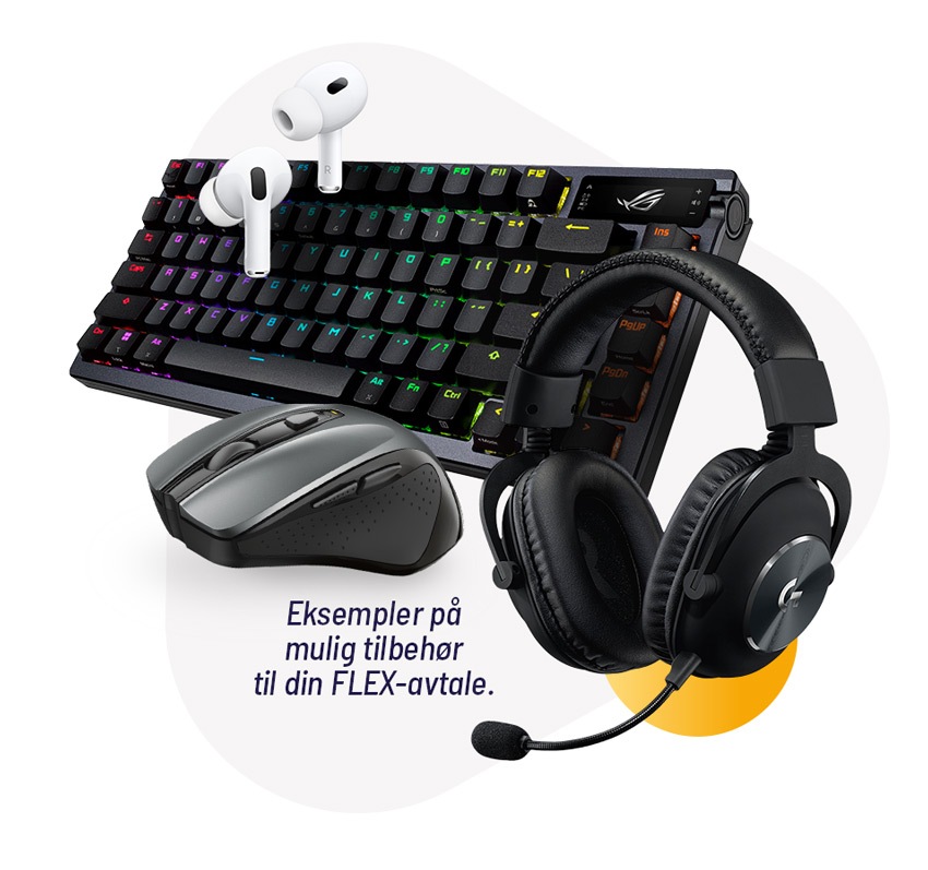 Vi tilbyr derfor å kjøpe headset, tastatur og annet tilbehør du kan trenge til ditt FLEX-produkt. Kostnaden for tilbehøret bakes inn i totalprisen når du bestiller med Komplett FLEX.