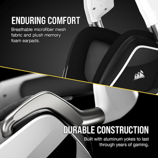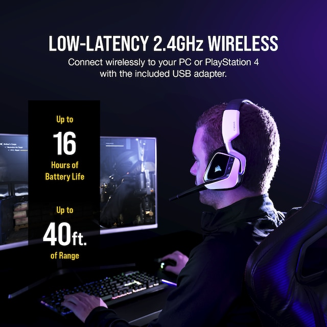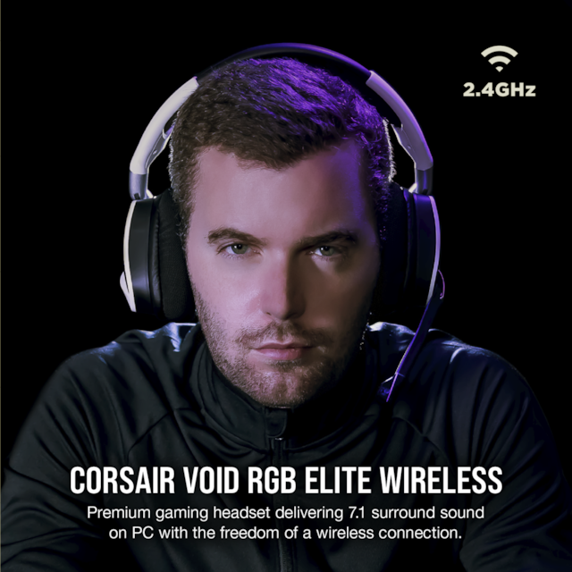 Lev deg inn i handlingen med CORSAIR VOID RGB ELITE Wireless, med fininnstilte 50 mm lyddrivere i neodym, behagelig nettingstoff i mikrofiber med øreputer av minneskum og en 2,4 GHz trådløs tilkobling.