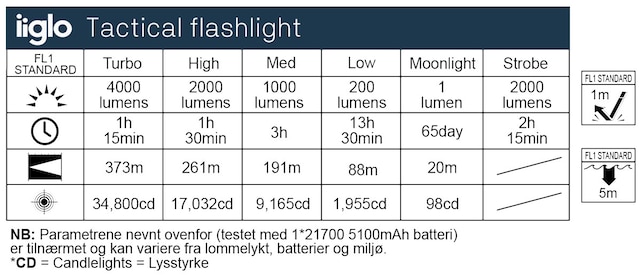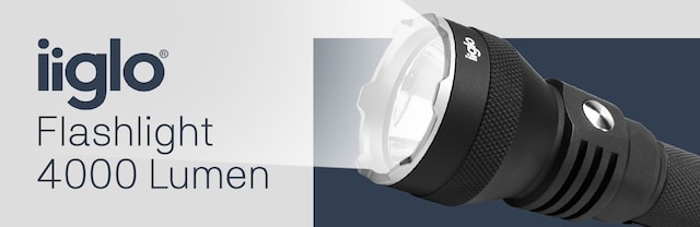 Iiglo Lommelykt 4000 LM har en veldig robust metallkonstruksjon og tåler fall på 1 meter. Den er også vanntett ned til 5 meter under vann. Lommelyktens gode grep og praktiske størrelse gjør den enkel å bruke ved enhver anledning.