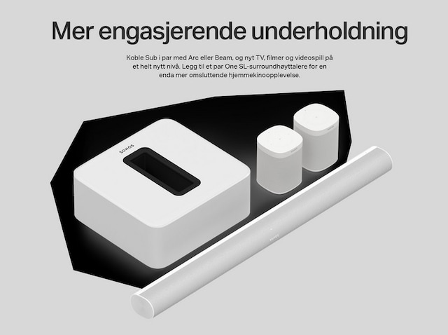 • Legg til mer dybde i lyden i hjemmekinoen når du kobler Sub sammen med den splitter nye Sonos Arc, Beam, Playbar eller Playbase. Få surroundlyd når du utvider konfigurasjonen med et par Sonos One- eller One SL-høyttalere.