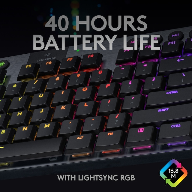 G915 tilhører en ny klasse av trådløse mekaniske spilltastaturer som kommer med 3 valg av lavprofils GL- brytere og 1 ms trådløs LIGHTSPEED- teknologi i proffklasse. Det kan levere 40 timers uavbrutt spilling på full lading. Alle tastene er fullt tilpassbare og med avansert LIGHTSYNC RGB teknologi kan du synkronisere belysningen med ethvert innhold.