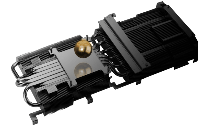 Varmesprederen trekker varmen opp i varmerørene, som fører den gjennom en ribbestabel som fyller det meste av kortets store fotavtrykk på 2,7 spor. Denne generasjonen av TUF Gaming-skjermkort har også en egen kjøleribbe for VRAM for å holde temperaturene godt under de maksimale driftsspesifikasjonene.