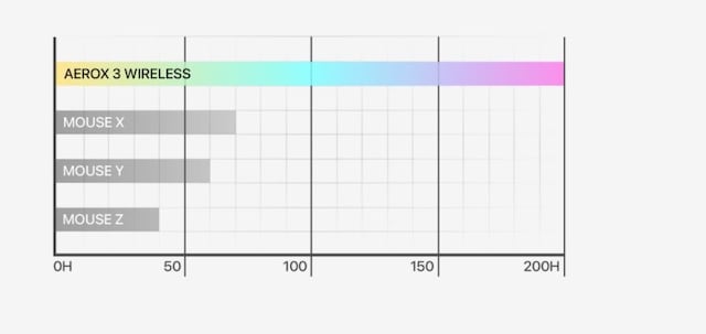 Aerox 3 Wireless-batteriet er konstruert spesielt for optimalisert strømforbruk, og leverer opptil 200 timers kontinuerlig bruk uten å ofre ytelse og vekt.
