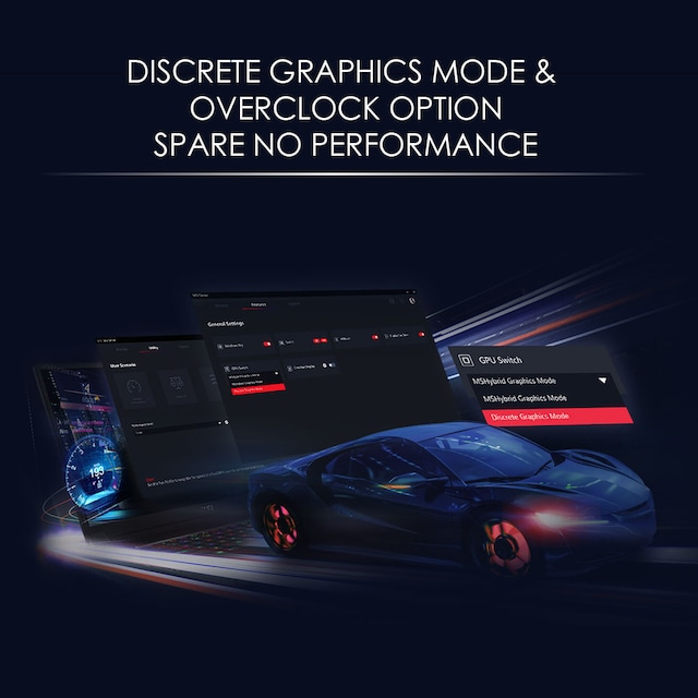 Velg mellom «Diskret grafikkmodus» eller «MSHybrid-grafikkmodus» (NVIDIA Optimus), grafikkteknologi-alternativene tilbyr kraftig spillytelse og effektivitet. Videre kan den grafiske effekten økes ytterligere gjennom alternativet for overklokking, med justerbar GPU-kjerneklokke og VRAM-frekvens via MSI Center i ekstremmodus.