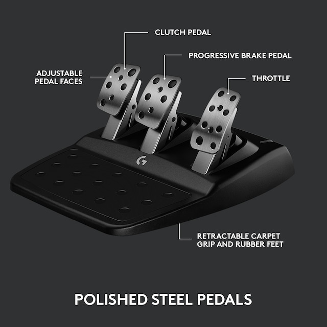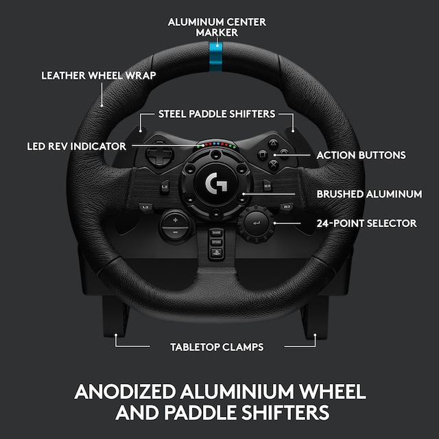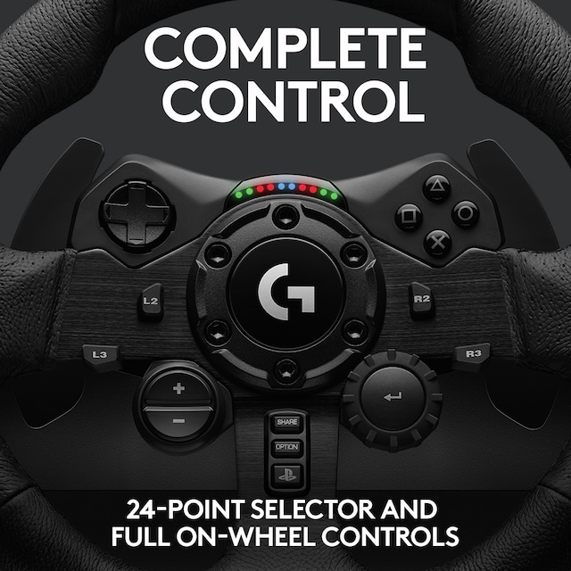 Logitech G923 er et høytytende racingratt som revolusjonerer e-racingopplevelsen. G923 er nyutviklet for å støtte et spillendrende feedbacksystem, og har TRUEFORCE, neste generasjons force feedback, som bruker spillfysikk for å levere en svært høy grad av realisme. Kjenn hvordan stemplene pumper, grusen knuses, og føl hvert skift, drift og hårnålssving som aldri før. En progressiv bremsepedal gjenskaper et trykkfølsomt bremsesystem, mens en programmerbar dobbeltclutch simulerer en ekte racingbilstart i støttede spill. Den strømlinjeformede designen har integrerte kontroller for bedre ytelse, med en innebygd 24-punkts valgknapp, fullstendige konsollkontroller og det klassiske RPM LED-displayet for støttede spill.
