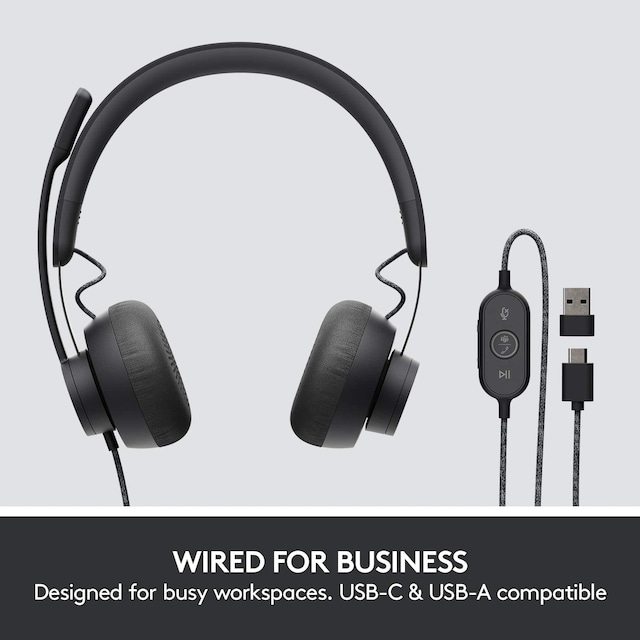 Logitech Zone Wired Noise Cancelling Headset er sertifisert for Microsoft Teams, med avansert støydempende mikrofonteknologi for åpne kontorlandskaper, USB-C med USB-A-adapter, grafitt.