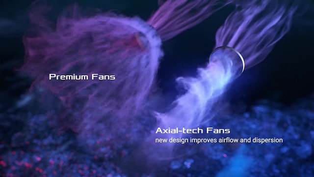 - Axial-tech viftedesign har et mindre viftenav som gjør det mulig med lengre blader og en barrierering som øker lufttrykket nedover.
