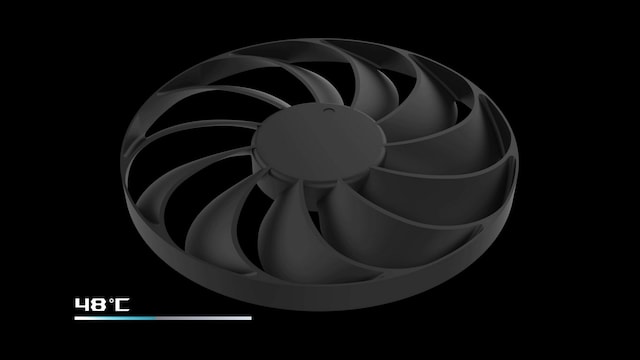 Et omhyggelig designet deksel, kjøleribbe og oppsett med varmerør gjør at de to aksialviftene kan utnytte ventilasjonen i sidepanelet på kabinettet og levere en kjøleytelse som står i kontrast til kortets størrelse.