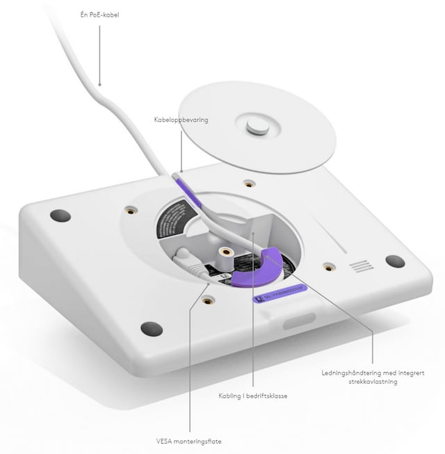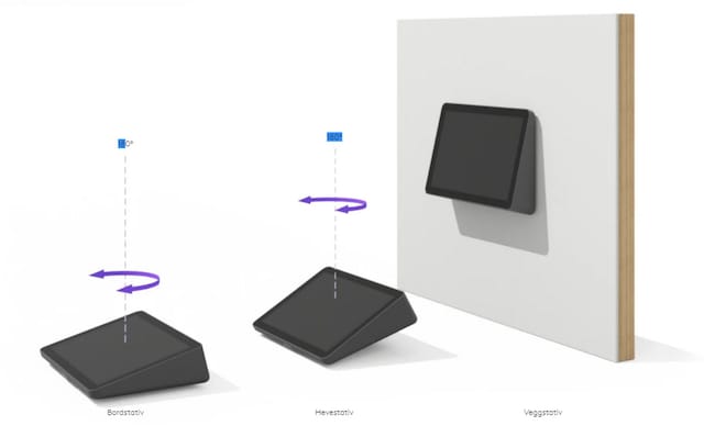 Du kan installere Tap IP så å si hvor som helst i rommet med bord- og hevestativ som passer standard gjennomføringshull i bordet og roter 180° for synlighet og bekvemmelighet. Eller spar bordplass i små rom med veggstativet.