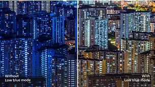 På samme måte som UV-stråler kan forårsake øyeskader, har studier vist at blått lys med kort bølgelengde fra LED-skjermer kan forårsake øyeskader og påvirke synet over tid. Philips LowBlue er utviklet for velvære og benytter seg av en intelligent programvareteknologi for å redusere skadelig blått lys med kort bølgelengde.