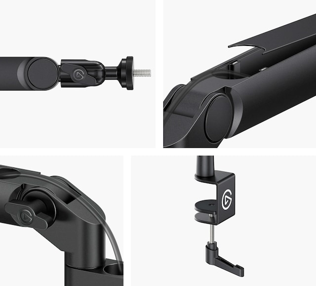 Et kulehode for presis mikrofonposisjonering. Spenningsjusterbare ledd for å finjustere sving- og fallmotstand. Perfekt klaring på skrivebordet for å få tilgang til arbeidsområdet ditt. Og en polstret klemme som holder riggen godt festet. Bare legg til mikrofonen din og begynn å snakke.