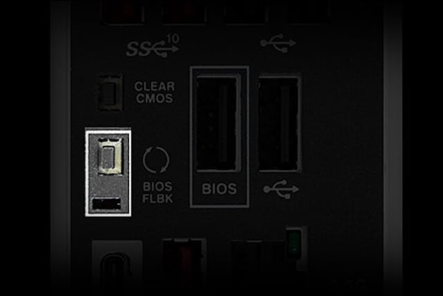 BIOS FlashBack™ er en sikker og enkel måte å oppdatere BIOS på. Bare legg (UEFI) BIOS-filen på en FAT32-formatert USB-pinne, koble den til USB BIOS FlashBack™-porten og trykk på knappen. Oppdateringer kan til og med utføres uten å ha noe minne eller CPU installert.
