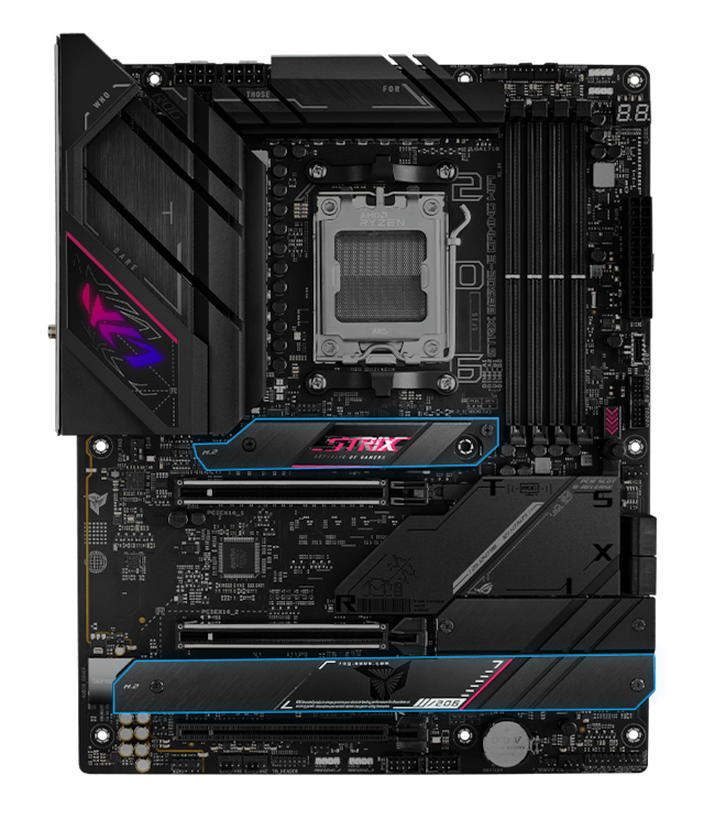 Strix B650E-E omfavner den nye standarden fullt ut, og tilbyr rikelig med PCIe 5.0-støtte for å gi uhindret båndbredde til de raskeste SSD-ene og skjermkortene som på markedet. Begge x16-utvidelsessporene støtter Gen 5, og er beskyttet med SafeSlot-holdebraketter. To av de innebygde M.2-sporene er laget for lese- og skrivehastigheter på 16 GB/s ved hjelp av PCIe 5.0-grensesnittet, mens det medfølgende 4.0-paret fortsatt leverer imponerende overføringer på 8 GB/s. Og alle M.2-sporene er dekket med omfattende kjøleribber for å gi neste generasjons kjøling av harddisker.