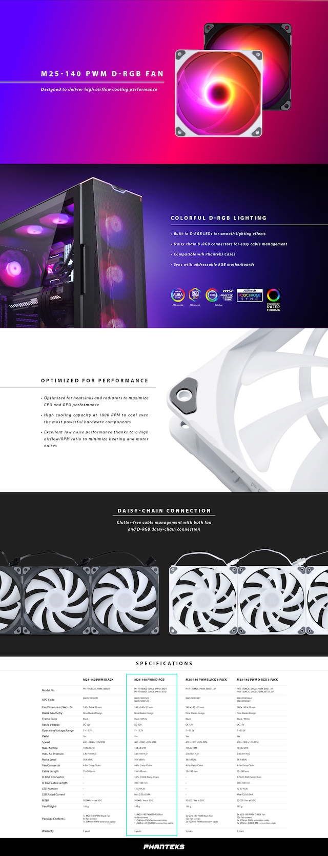 The Phanteks M25 fans build upon the award winning T30 fan to keep next gen hardware cool with high airflow cooling performance. The M25 fan blades are specifically optimized to perform the best with fine mesh/dust filters, heatsinks and radiators with reduced RPM levels. This optimization keeps unwanted bearing noises at a minimum while also leaving plenty of cooling headroom, when necessary, by going full speed. By sharing some of its design with the T30, the M25 stands out by delivering higher airflow through heatsinks and radiators with lower RPM levels with exceptional value. The wide RPM range, up to 2000 RPM, can be precisely controlled through PWM to ensure the M25 is excellent for both quiet and high-end gaming systems.