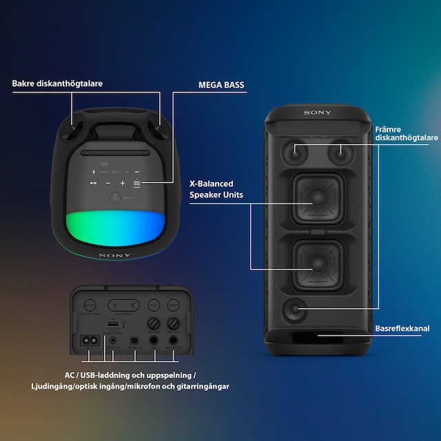 Sony SRS-XV800 er en trådløs festhøyttaler med kraftig 360°-lyd som du kan nyte hvor som helst, dag og natt, takket være utrolig lang batteritiden og imponerende funksjoner.