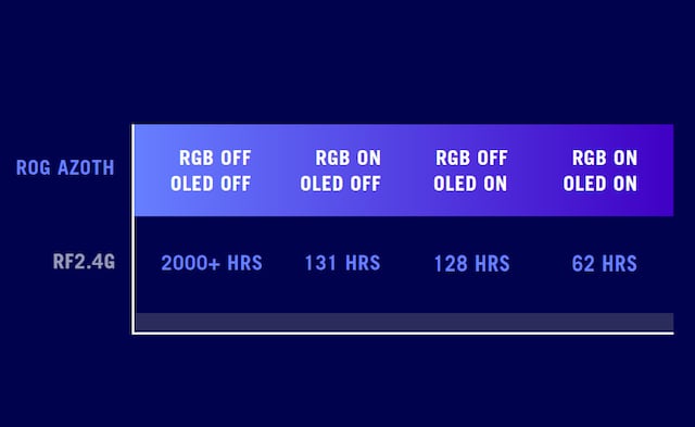 ROG SpeedNova trådløs teknologi tilbyr opptil 2000+ timer med stabil, uavbrutt spilling med nesten null-ventetid i 2,4 GHz RF-modus (RGB og OLED av). Alternativt kan du bruke Bluetooth-modus for å koble til opptil tre enheter samtidig, eller du kan lade og spille av samtidig i kablet USB-modus.
