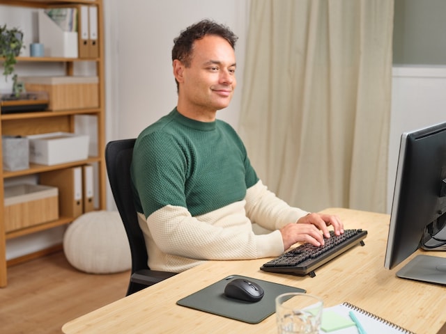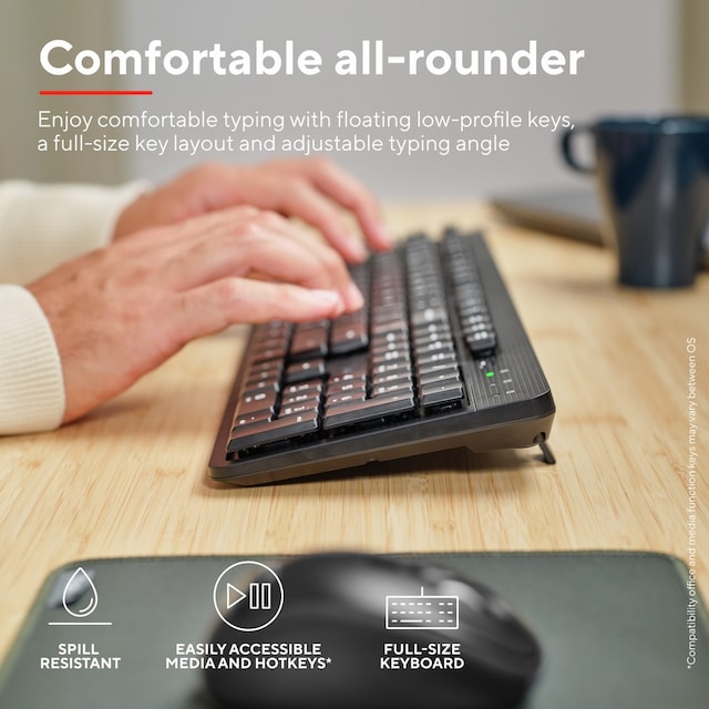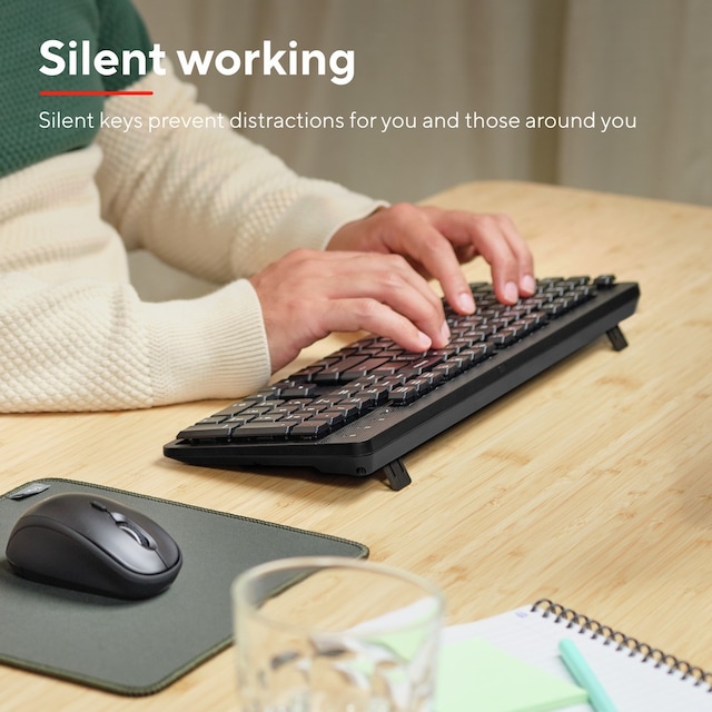 Tynt og stillegående trådløst tastatur for timevis med arbeidskomfort.