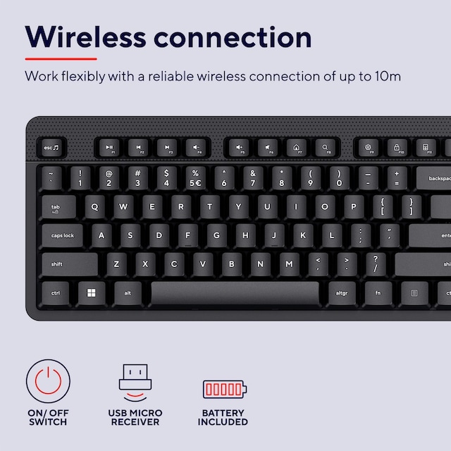 Ingen irriterende kabler som kommer i veien for deg – dette tastaturet er fullstendig trådløst og gir deg all fleksibiliteten du trenger mens du arbeider. Med en praktisk USB-mottaker, magnetisk og som kan oppbevares på innsiden av tastaturet, er det bare å koble til den bærbare datamaskinen eller PC-en, og du er i gang.