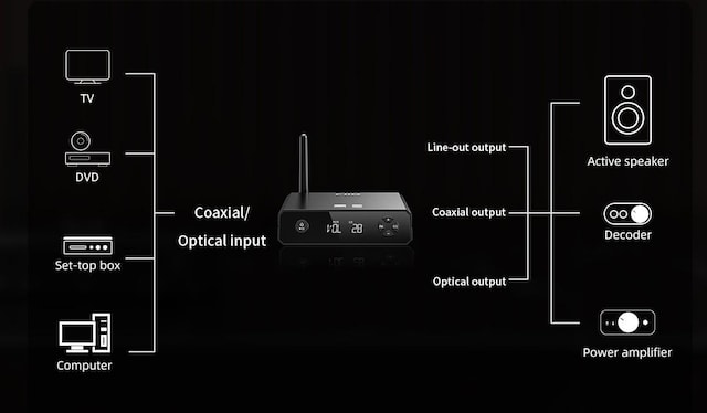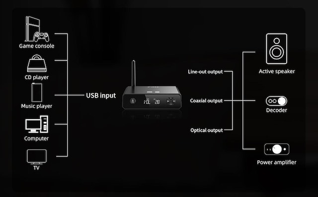 I tillegg til at BR13 er en bluetooth-mottaker har enheten også USB-C, Coax og optisk inngang. På denne måten kan man koble til alt fra TV, Playstation, CD-spiller og DAP og sende det videre til aktive høyttalere, forsterkere eller rett inn i ett effekttrinn.