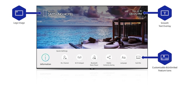 Hver Samsung hotellskjerm har en intuitiv startmeny som kan tilpasses og som gjør utvekslingen av innhold mellom hoteller og gjester strømlinjeformet. De som administrerer innholdet, kan legge inn bilder, logoer og funksjonssymboler som dekker gjestenes spesifikke behov og samtidig styrker spesialttilbud og hotellenes merkeprofilering