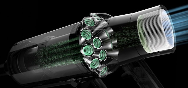 14 sykloner genererer krefter på mer enn 79 000g for å kaste mikroskopiske partikler – som pollen og bakterier – i søppelbøtta.