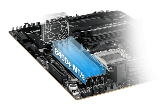 Strix X870E-E omfavner den nye standarden fullt ut og tilbyr ende-til-ende PCIe 5.0-støtte. Det øverste x16-utvidelsessporet er Gen 5-ready, og er beskyttet med en SafeSlot-holderebrakt for å tåle vekten av de nyeste skjermkortene. Tre av de innebygde M.2-sporene er utstyrt for lese- og skrivehastigheter på 16 GB/s takket være PCIe 5.0-grensesnittet, mens alle resten kan levere fortsatt imponerende 8 GB/s overføringer. Hvert M.2-spor er dekket med betydelige kjøleribber for å sende varmen fra neste generasjons harddisker.