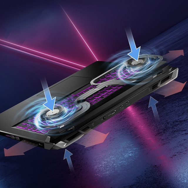 Det nyraffinerte kabinettet har noen få ekstra triks i ermet: kjøling med to vifter, fire inntak (øverst og i bunnen) og en design med fire eksosrør sammen med vector-varmerør. Dette inkluderer også de kjølende effektene av flytende termisk metallfett på en allerede kraftig AMD Ryzen™ 7 8845HS-prosessor.