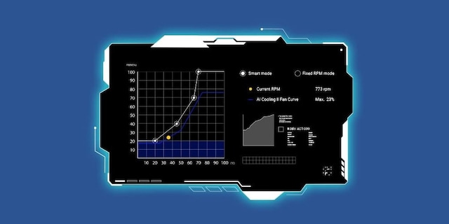 ASUS AI-løsninger inkluderer AI Advisor som din tekniske ekspert med ekspertise innen PC-ytelse og AI Cooling II for automatisk temperaturkontroll.