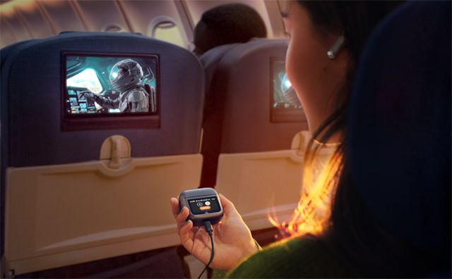 Smart Charging Case™ forvandles til en dongle som trådløst overfører lyd til øreproppene fra en hvilken som helst AUX- eller USB-C-kilde, for eksempel TV-en eller underholdningssystemer på treningsstudio eller fly. Bare bruk en av de to medfølgende lydkablene for å koble til og nyte. Eller bruk Auracast™-knappen på skjermen til å dele innholdet ditt til enheter i nærheten ved å koble enheten til Tour Pro 3 Smart Charging Case™.