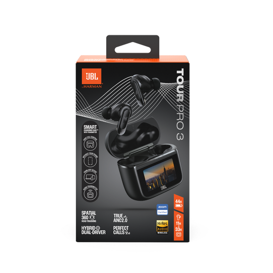 Gjør deg klar for de smarteste helt trådløse øreproppene hittil. JBL Tour Pro 3-øreproppene leveres i et nydesignet Smart Charging Case™ med en praktisk og mer funksjonsrik berøringsskjerm som gir deg full kontroll over lytteopplevelsen – mens telefonen forblir i lommen. Koble sømløst til alle Bluetooth®-enheter, og fordyp deg i musikk, filmer og spill med JBL Spatial 360-lyd med hodesporing. JBL Tour Pro 3 er også drevet av legendariske Hi-Res JBL Pro Sound. Når det er tid for å jobbe, kan du stenge verden ute med ekte adaptiv støydemping i sanntid. På en flyreise kan du bruke Smart Charging Case™ som en lydsender-dongle for å koble deg trådløst til systemet (eller PC-en) om bord og nyte den filmatiske lydopplevelsen mens du er i luften. Eller ved skrivebordet kan du enkelt koble Smart Charging Case™ til datamaskinen for perfekt samtalekvalitet.