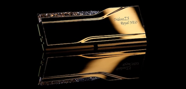 Trident Z5 Royal Neo er luksusklassen av ekstrem overklokking ytelse DDR5-minne designet for AMD AM5-plattformer, med et kronede design og en krystallklar lyslist for en strålende visning av tilpassbar RGB-belysning og elektroplaterte aluminium varmefordelere med speilfinish i gull eller sølvfarger.