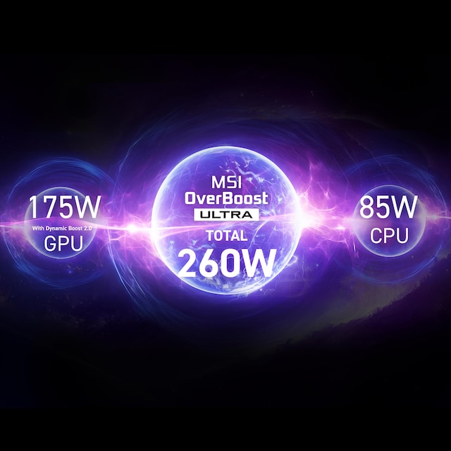 Når det er ekstremt arbeidsbelastninger som krever full CPU- og GPU-ressurser, leverer MSI OverBoost Ultra teknologi maksimalt kombinert CPU- og GPU-ytelse, eller setter Max Boost-ytelse på tvers av alle 8 P-kjerner når bare CPUen brukes.