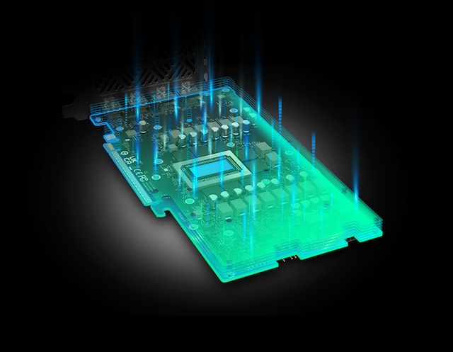 GPU-en er montert på det høy-densitets 12-lags 2oz Kobber og high TG PCB for å matche den raske hastigheten, høye strømstyrken og økte strømbehovet til GPU-en og minnet for å garantere høy stabilitet av PCB-en under drift.