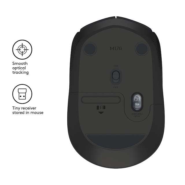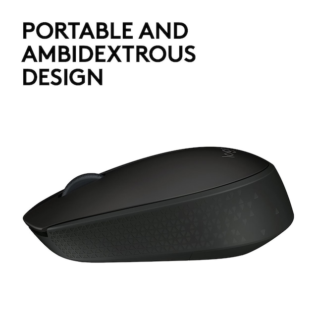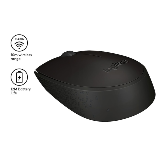 Den komfortable trådløse Logitech Mouse B170 fungerer like pålitelig som en mus med kabel i en rekkevidde på opptil 10 m rekkevidde – takket være den avanserte 2,4 GHz-teknologien.