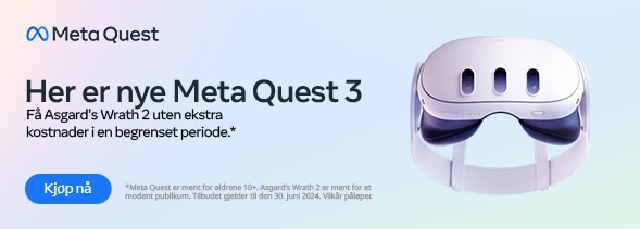 - Få episke spill når du kjøper Meta Quest 3 med 512 GB – inkludert nye Asgard’s Wrath 2 og 2 kostnadsfrie spill per måned med et 6-måneders prøveabonnement på Meta Quest+. Tilbudet varer til 27. januar 2024.