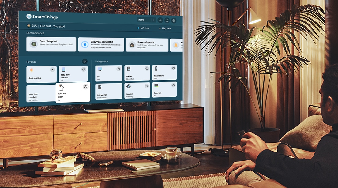 Med appen Smart Things styrer du enkelt teknologien i det smarte hjemmet ditt. Du kan også skjermdele trådløst fra mobilen via WiFi, Bluetooth eller Airplay 2, og la Multi View dele skjermen i to, slik at du kan se på TV og mobilinnhold samtidig.*