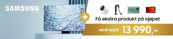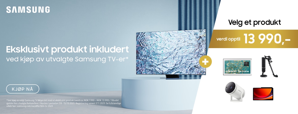 *Ved kjøp av Samsung QLED TV Q80C (98"), Samsung The Frame (65"-85"), Samsung UHD CU8005/CU8075 (85"), Samsung Neo QLED TV QN85C (65"-85"), QN90C/QN95C (55"-85"), QN100C (98"), QN800C/QN900C i valgfri størrelse, Samsung Neo QLED TV QN85B (75”-85"), QN90B/QN91B/QN93B/QN95B (75”-85"), QN700B/QN800B/QN900B I valgfri størrelse, Samsung OLED TV S89C (77") eller S90C/S91C/S92C/S93C/S94C/S95C eller Samsung Soundbar HW-Q995C (ca. pris mellom NOK 15 999 - 109 990) hos utvalgte forhandlere i Norden inngår ett av følgende tilleggsprodukter: The Freestyle (SP-LSP3BLAXXE, verdi ca. NOK 7 990), Bespoke Jet AI (VS28C9784QK/WA, verdi ca. NOK 13 990), The Frame 43" TV (TQ43LS03BGUXXC, verdi ca. NOK 12 999) eller Galaxy Tab S9 (SM-X710NZEAEUB, verdi ca. NOK 9 490). Tilbudet gjelder for kjøp mellom 07.08.2023 og 15.10.2023. Kampanjen gjelder én gang per husstand og gjelder kun privatpersoner. For å benytte deg av tilbudet, registrer kjøpet på samsung.com/no/offer/b2s-tv-2023 senest 7. november 2023. Tilbudet gjelder så langt lageret rekker. Hvis tilleggsproduktet går tomt i løpet av kampanjeperioden, forbeholder Samsung seg retten til å bytte tilleggsproduktet til et tilsvarende produkt av tilsvarende verdi. Samsung har rett til å kreve tilbake det leverte tilleggsproduktet innen 30 dager hvis kjøper velger å returnere det kjøpte hovedproduktet. Kan ikke kombineres med andre tilbud. Fullstendige vilkår: samsung.com/no/offer/b2s-tv-2023