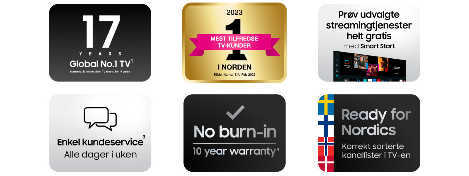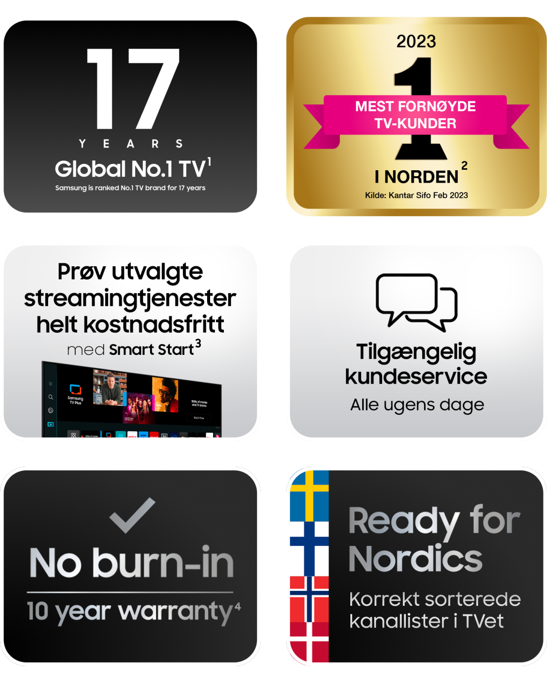 1 Kilde – Omdia, januar 2023. Resultatene er ikke ment som en anbefaling av Samsung. Tillit til resultatene skjer på tredjeparts eget ansvar. 2 Ifølge en spørreundersøkelse gjennomført av Kantar Sifo i januar 2023 er 93 % av de spurte fornøyde med sin Samsung-TV. Resultatene er ikke ment som en anbefaling av Samsung. Tillit til resultatene skjer på tredjeparts eget ansvar.3 Gjelder ved kjøp av utvalgte projektormodeller og utvalgte 2023-modeller av Samsung-TV på samsung.com og hos utvalgte forhandlere i perioden 20.04–31.12.2023. Underlagt begresninger, og strømmetjenestetilbudene som er inkludert, kan variere under kampanjen. Krever at kunden oppretter konto hos den aktuelle strømmetjenesten. Samsung kan vise reklame og kampanjer på Smart TV-grensesnittet og i applikasjoner. Tilgjengeligheten av apper kan variere over tid og avhengig av region. Vilkår: samsung.com/no/tvs/smart-tv/smart-start. 4 Garantien gjelder i 10 år fra kjøpsdato. Krever en kopi av kjøpskvittering og registrering på Samsungs nettsted innen 90 dager etter kjøp. Gjelder for kjøp av utvalgte 2023 TV-modeller mellom 20.04.2023 og 31.03.2024. Se vilkår på: samsung.com/no/offer/offline/screen-burn-warranty