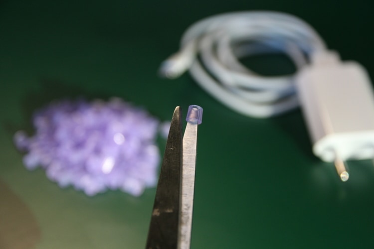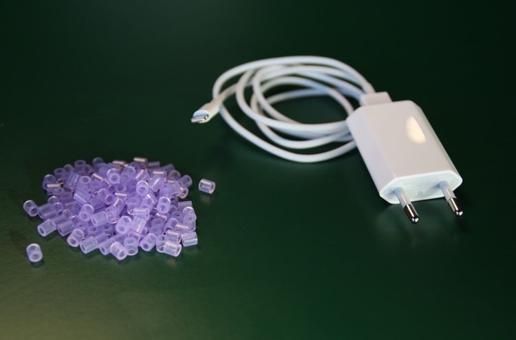 SLIK GJØR DU: Klipp en åpning i plastperlene og træ dem på ladekabelen. FOTO: VG PARTNERSTUDIO