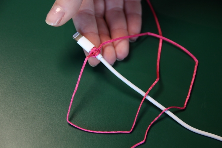 SLIK GJØR DU: 1. Knyt tråden fast nederst ved ladekabelen, det skal være like lang tråd på begge sider. 2. Legg trådene som avbildet, med en løkke over ledningen på venstre side. Tråden på ledningens høyre side skal bak ledningen og gjennom løkken. 3. Stram tråden slik at det blir en knute. 4. Gjør deretter det samme på motsatt side, da med en løkke over ledningen mot høyre. 5. Ta tråden på venstre side bak ledningen og gjennom løkken. 6. Stram knuten. 7. Gjenta til du du har dekket ledningen i passe lengde. FOTO: VG PARTNERSTUDIO