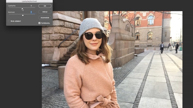 I Photoshop er det mange måter å justere kontraster og lys i bildet, men ofte er det enklest å velge Lysstyrke/kontrast, som du finner når du trykker på Bilde >Justeringer i menyen.