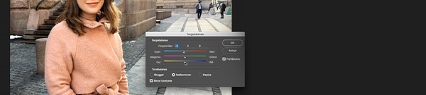 Klikk på Bilde > Justeringer > Fargebalanse, og skyv pilen vekk fra fargen du ønsker å redusere.