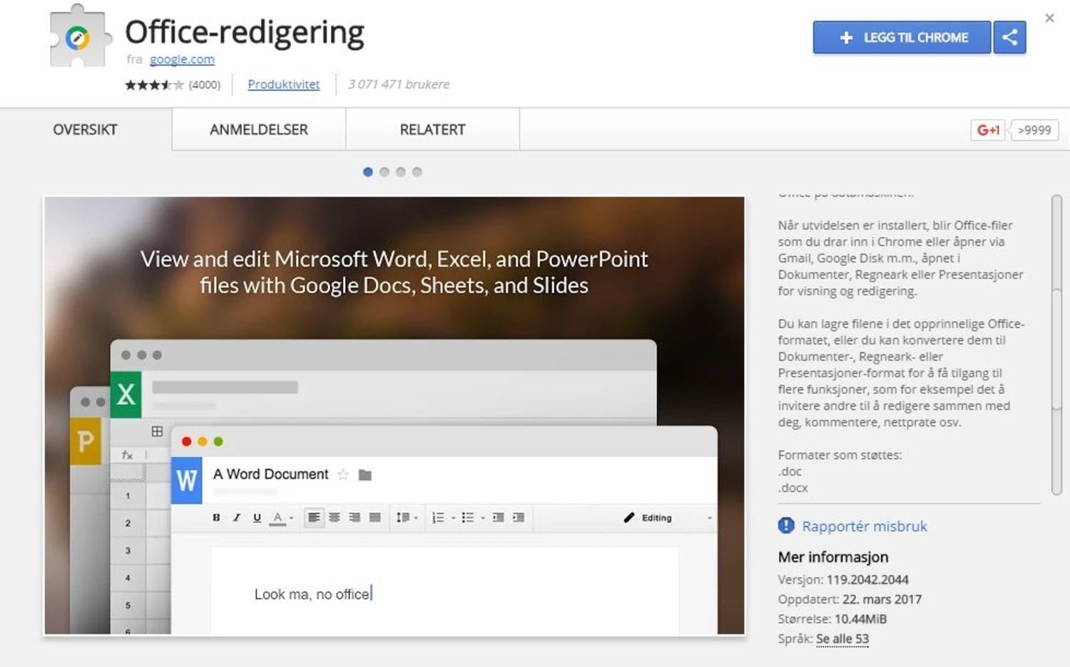 Har du en Mac eller PC uten Office-pakken? Da er dette tillegget for deg. Det lar deg åpne Word- Excel- og PowerPoint-filer i Googles egne programmer på nett.