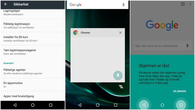 SLIK LÅSER DU: Gå til «innstillinger» og «sikkerhet». Under avansert finner du «fest vindu», «èn-appsmodus» eller tilsvarende; der velger du «på». Deretter åpner du ønsker app, trykker på oversiktsknappen (firkant), og velger knappenålsikonet nede i høyre hjørne. For å skru av igjen funksjonen holder du inne trekant og firkant samtidig. FOTO: SKJERMDUMP ANDROID LOLLIPOP