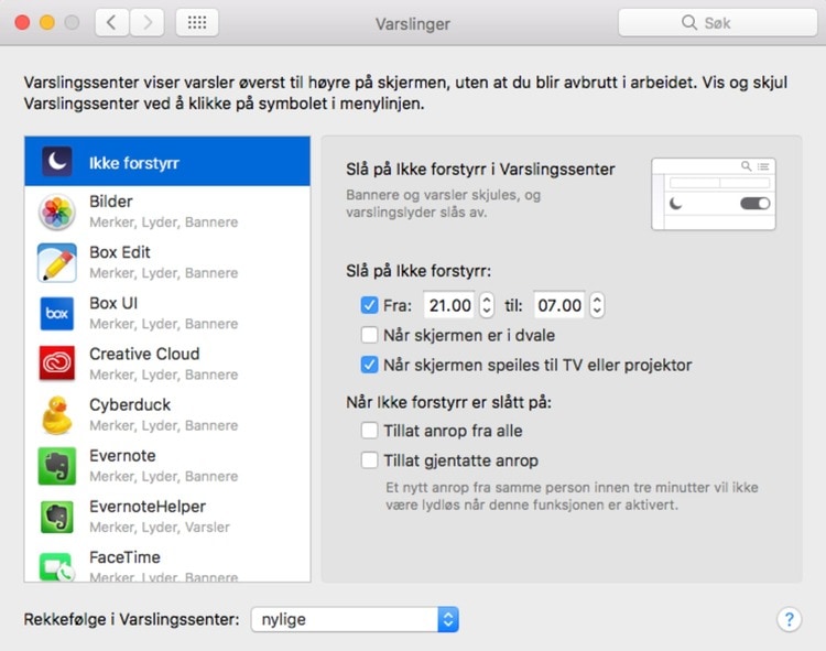 Trykk på de tre strekene som er øverst til høyre på skjermen (der du finner spotlight-søk, klokke, etc.). Da kommer det et vindu ut fra høyre side. Scroll til toppen av dette. Der finner du knappen «Ikke forstyrr»/ «Do not disturb». Aktiver denne, og du vil slutte å få varslinger fra Facebook, e-post, meldinger, eller andre programmer som kan ødelegge arbeidsflyten.
