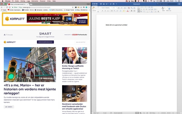 Hold den grønne prikken øverst til venstre inne på vinduet du har åpent. Et blått felt åpner seg på hver halvdel, og deretter slipper du vinduet på den halvdelen du ønsker. Klikk deretter på det andre vinduet du ønsker å ha ved siden av. Nå kan du multitaske for harde livet.