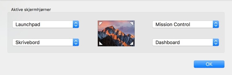 Klikk på eplet øverst i venstre hjørne > Systemvalg/System preferences > Mission Control > Klikk «aktive hjørner»/«Hot corners» nederst til venstre > Velg hva de ulike hjørnene skal gjøre.