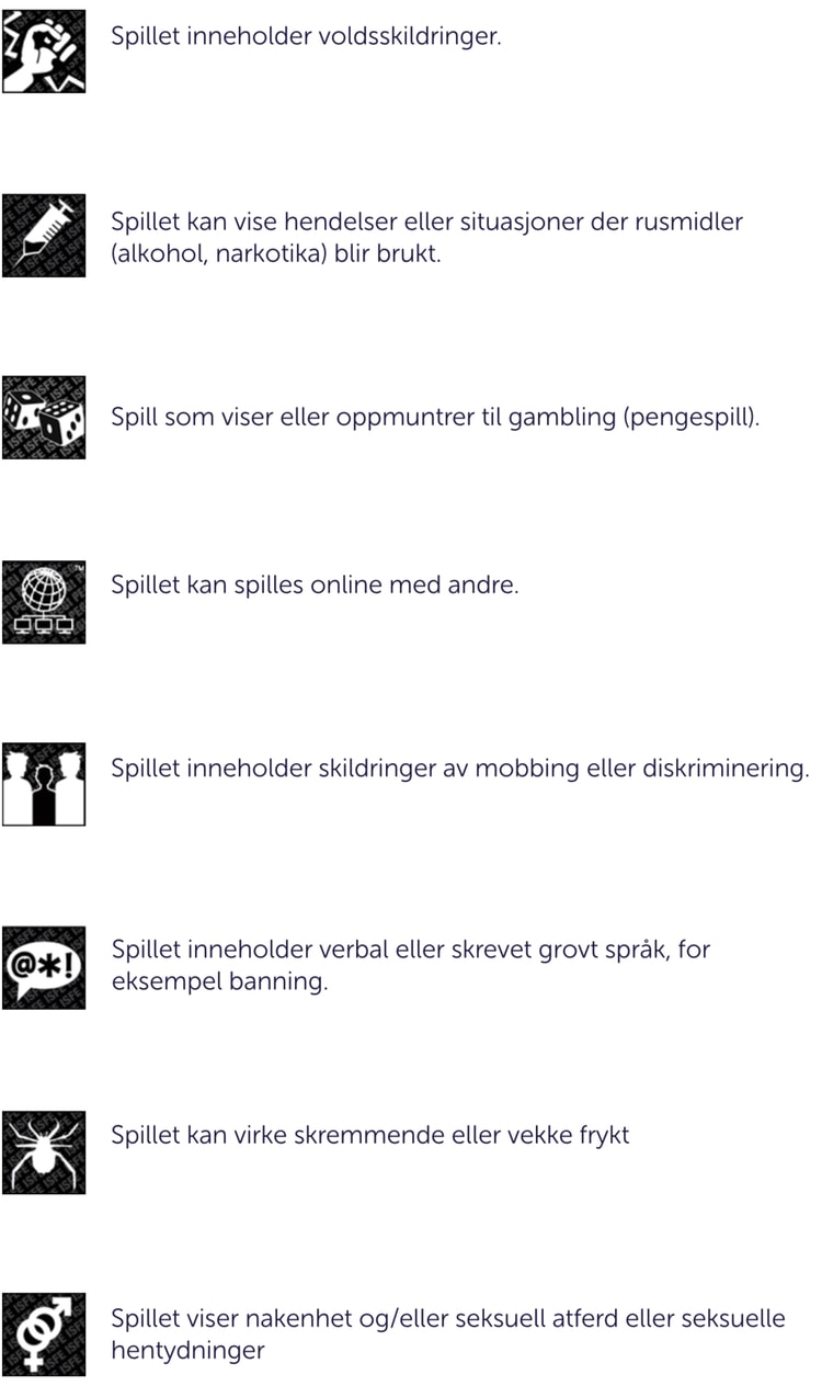 I tillegg til veiledene aldersmerking har noen spill innholdsmerking på omslaget. Innholdsmerking viser årsaken til aldersgrensen på spillet.