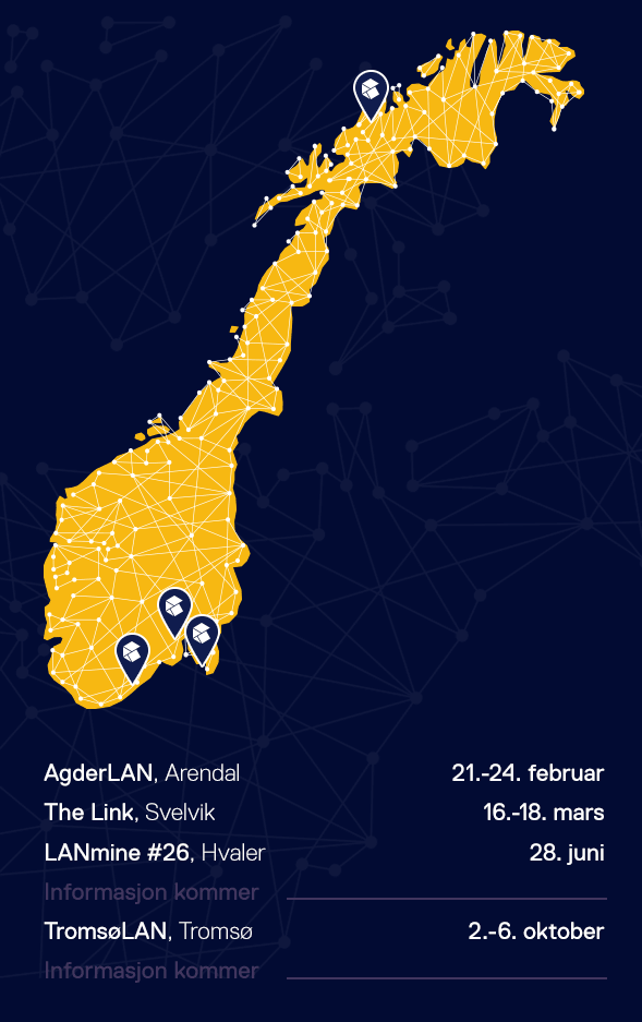 Her ser du hvor vi skal ta turen. Vi besøker mindre kjente datatreff i alle deler av landet, og ruta strekker seg fra Arendal i sør til Tromsø i nord. Vi har allerede fått endel tips, men vi har fortsatt igjen noen jokere. Tips oss gjerne om LAN vi bare MÅ besøke, send ditt forslag til event@komplett.no.