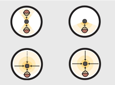 Fire ulike opptaksmønstre: stereo, kardioide, omnidireksjonell og bidreksjonell